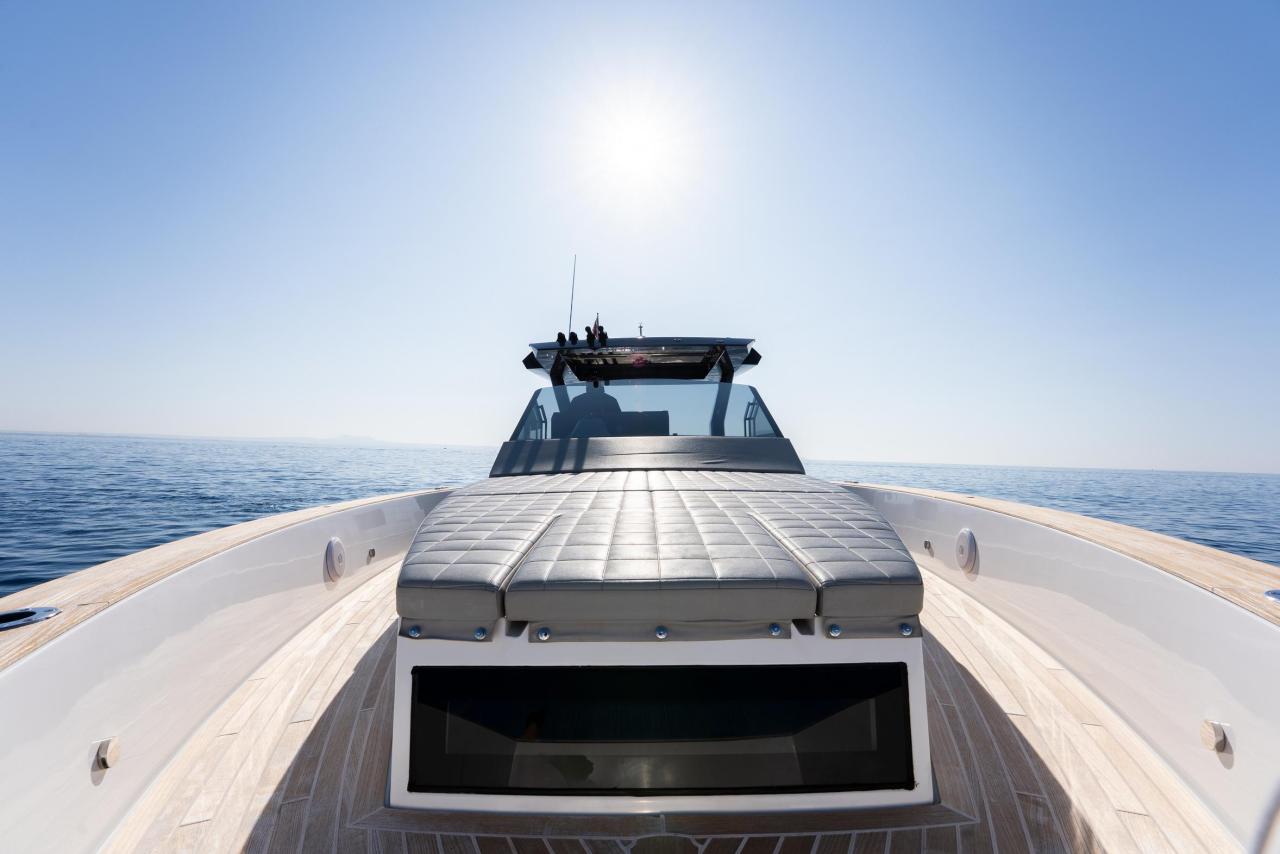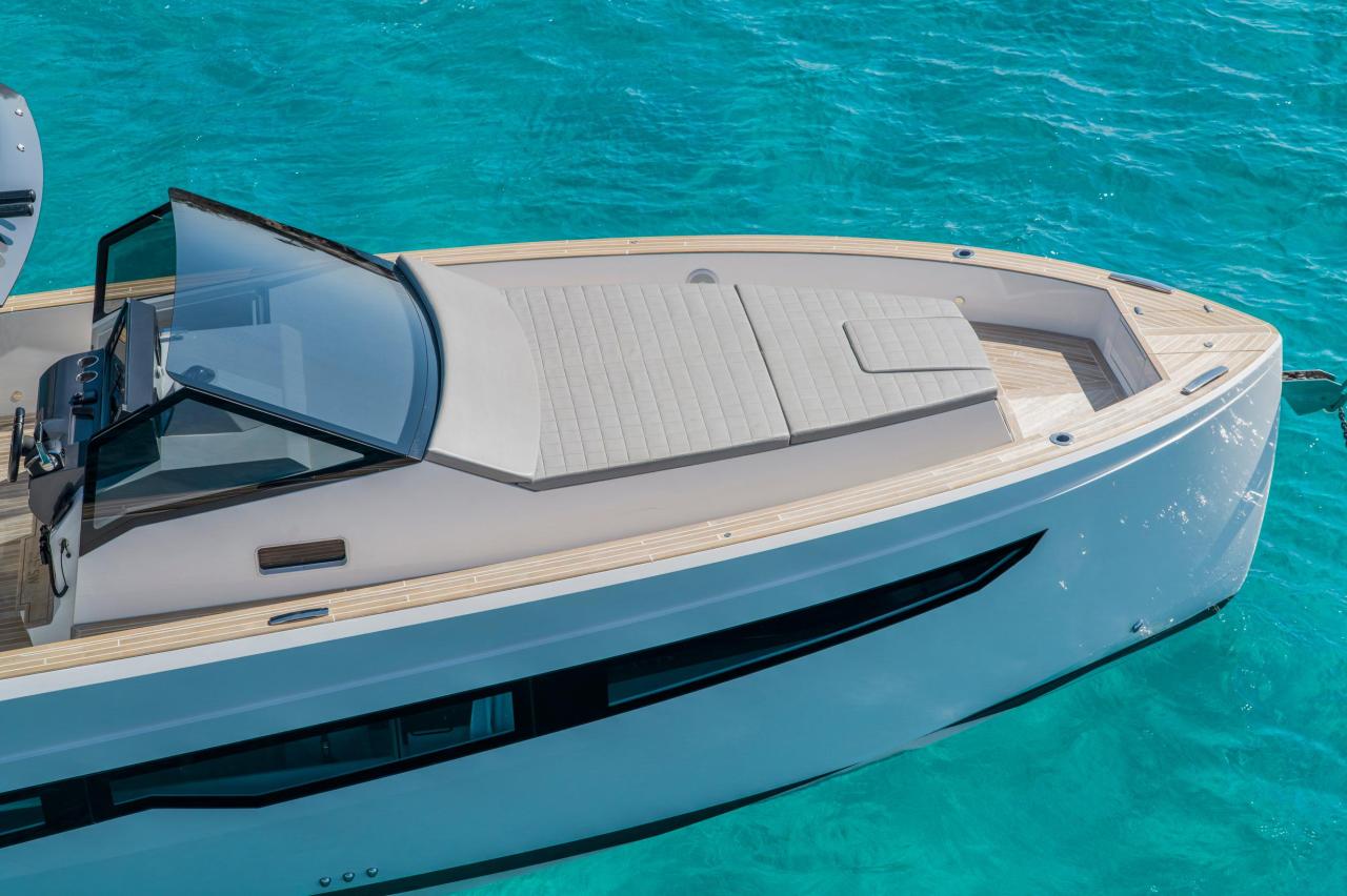 Sur le pont, VIRAGE OF LONDON propose un aménagement pensé aussi bien pour la convivialité que pour la détente. De vastes bains de soleil à l’avant, un élégant carré en L dans le cockpit avec appuis-tête modulables et de généreuses tables en teck pliantes créent l’espace idéal pour recevoir vos invités. Une plateforme hydraulique rabattable sur tribord prolonge encore l’espace de vie, reliant harmonieusement les passagers à la mer. Les finitions haut de gamme, le pont en teck intégral et le raffinement des détails mettent en valeur le savoir-faire de Fiart et son souci du design.