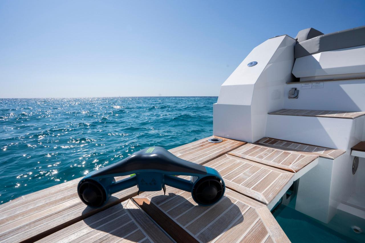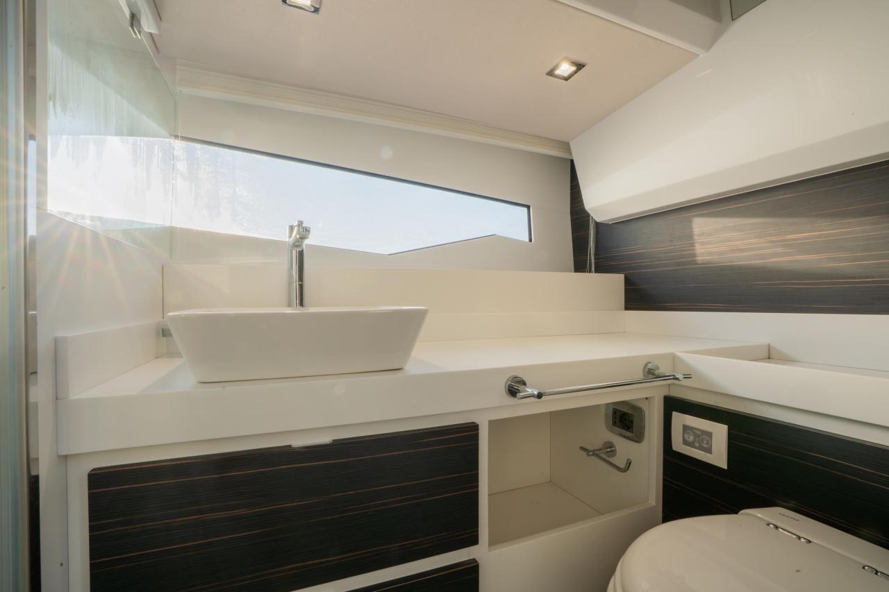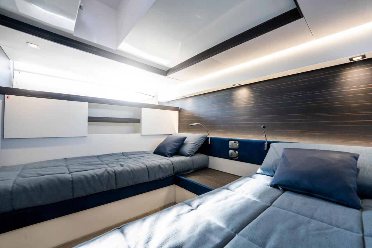 Sous le pont, le 39 SW surprend par son volume intérieur généreux pour un bateau de cette taille, ce qui le rend idéal pour des escapades le temps d’un week-end. La cabine propriétaire dispose d’un lit double et de solutions de rangement raffinées, tandis que la cabine twin bénéficie d’une belle hauteur sous barrots et de lumière naturelle. Une salle d’eau indépendante, entièrement équipée avec douche séparée, apporte confort et praticité. Avec la climatisation, un système audio Fusion et une Smart TV Samsung, le yacht combine luxe et commodité.