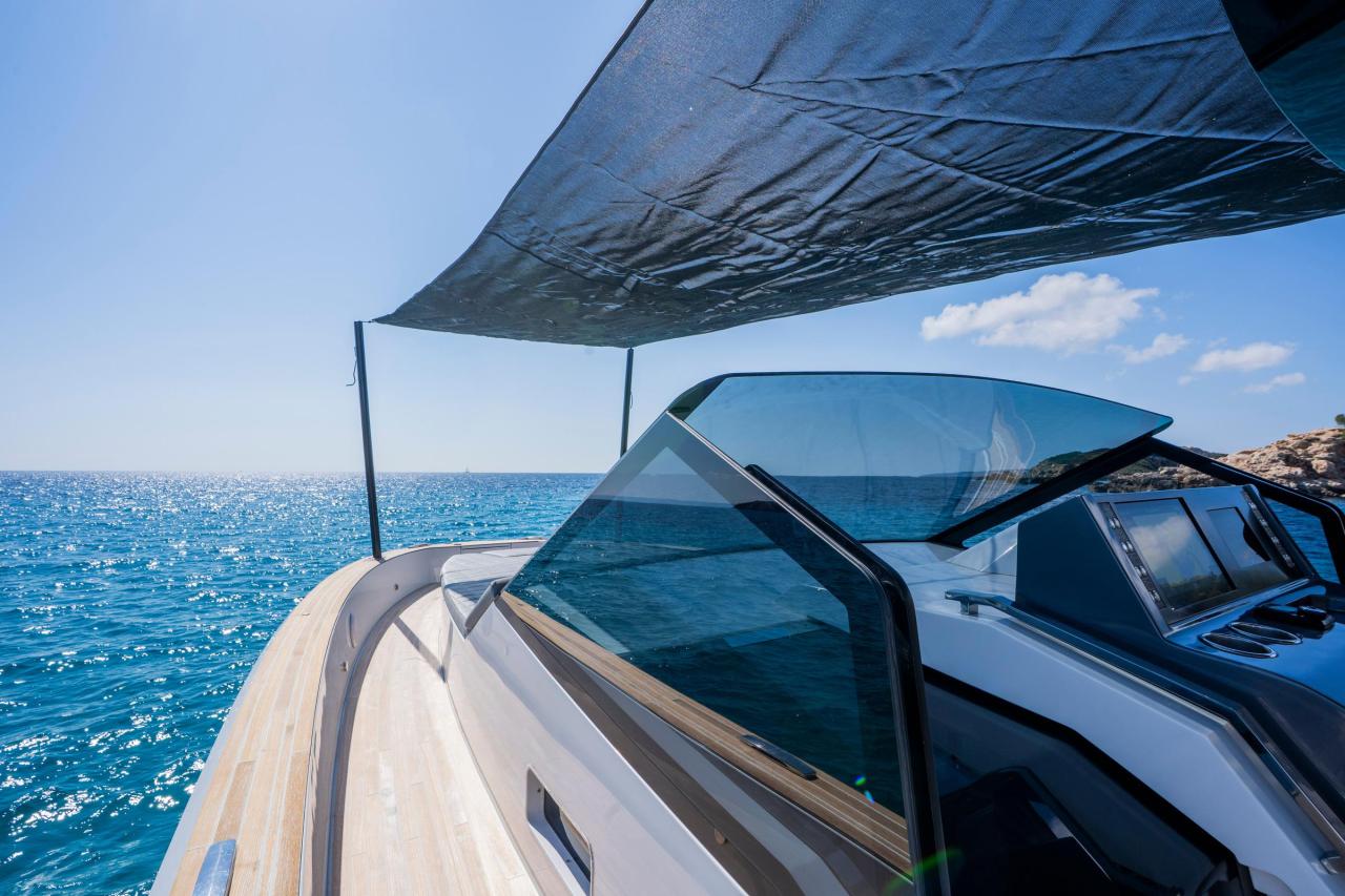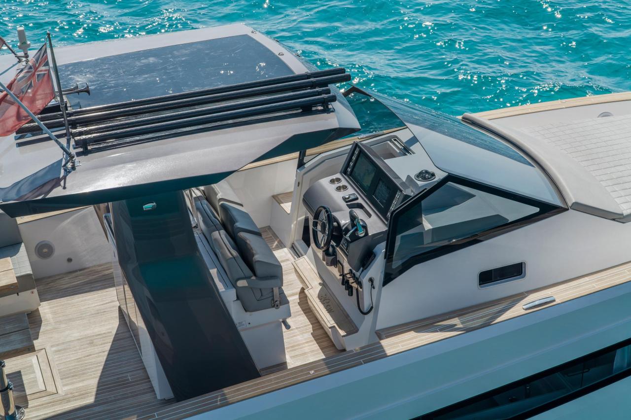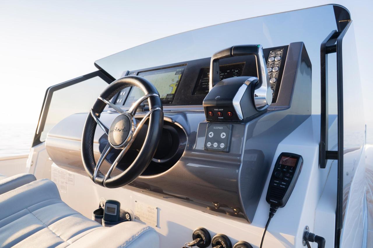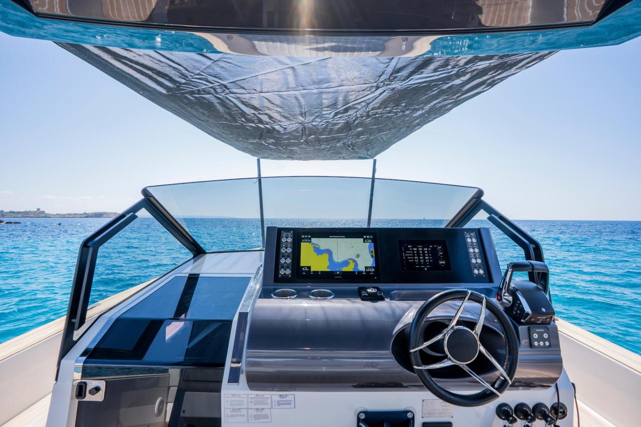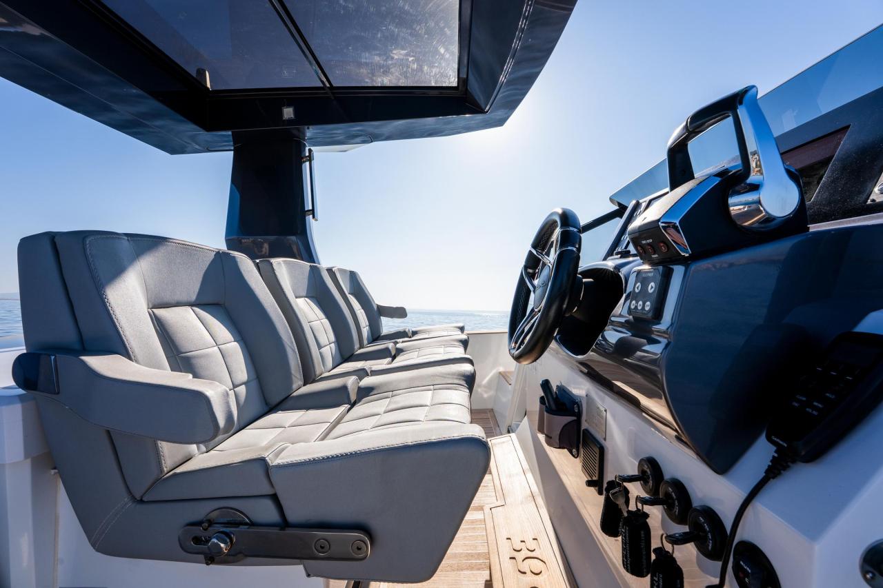 Le poste de pilotage est doté d’un tableau de bord élégant en finition gris brillant, de trois assises semi-assises/debout et d’un système Garmin Glass Helm GPSMAP 8600, garantissant une navigation précise et un contrôle aisé. Propulseur d’étrave et système de flaps Zipwake complètent une prise en main fluide et sans effort.