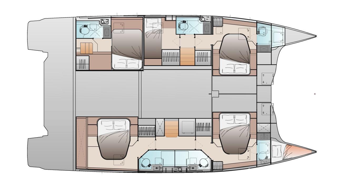 Le New FP | 48 est disponible en version Maestro - 3 cabines ou en version Quintet - 5 cabines. D'une part, la version Maestro vous offre de grands espaces lumineux et la possibilité de personnaliser la cabine avec un meuble bas ou bureau, et un volume avant en grande salle de bain, en cabine bébé ou atelier au choix. D'autre part, la version Quintet offre 4 grands lits doubles, orientés face à la mer, et une cabine avec deux lits simples superposés, idéal pour les enfants ou membres d'équipage.