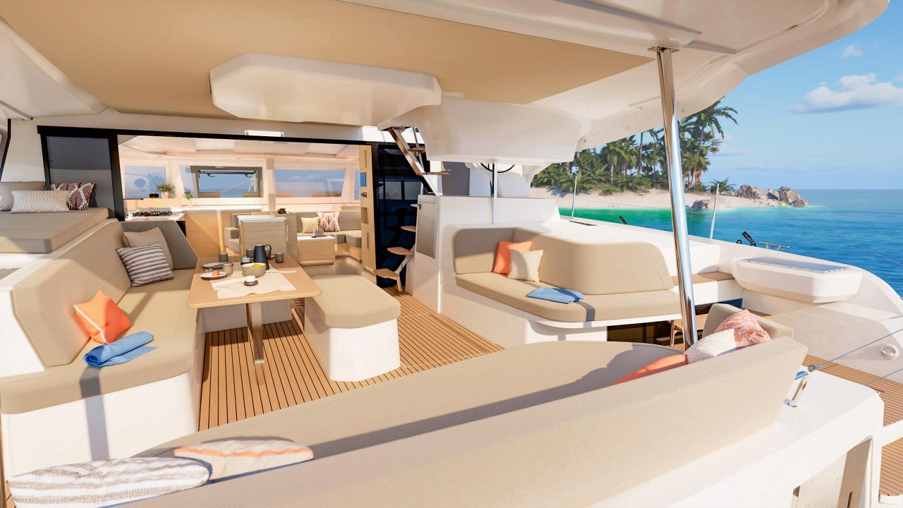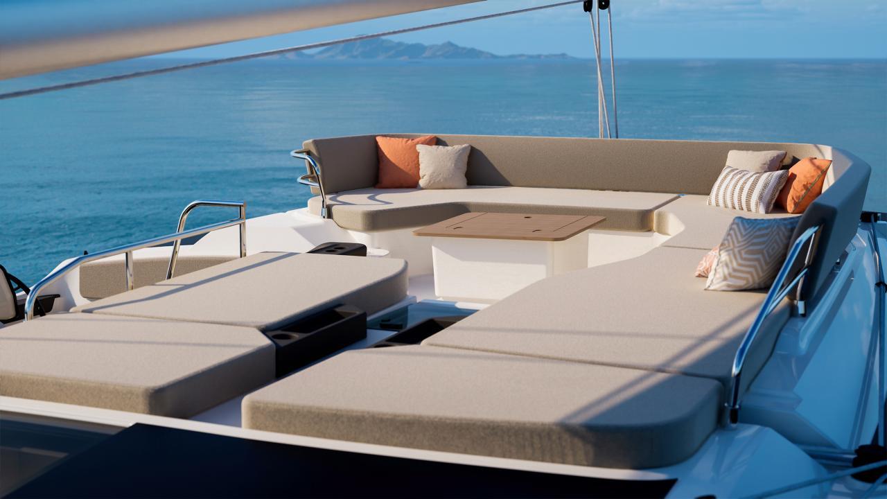 Le NEW FP | 48 vous surprendra par son aménagement unique et innovant, pensé pour les amoureux d'espace et de confort. Grâce à sa grande ouverture de 3m de large, ses grands hublots et son passe-plat avant, le FP | 48 est totalement connecté et tourné vers l'extérieur, vers l'océan. Son large carré permet d'accueillir un îlot central élargi, un espace cuisine avec de nombreux rangements et une grande banquette pouvant accueillir tous les membres d'équipage. A l'extérieur, vous n'avez plus qu'à choisir votre espace de détente au soleil : une méridienne arrière face à l'horizon, de larges banquettes dans le cockpit ou les grands bains de soleil à l'avant. Pour les amoureux de hauteur, privilégiez le Flybridge qui offre assises et bains de soleil, très agréables en navigation.