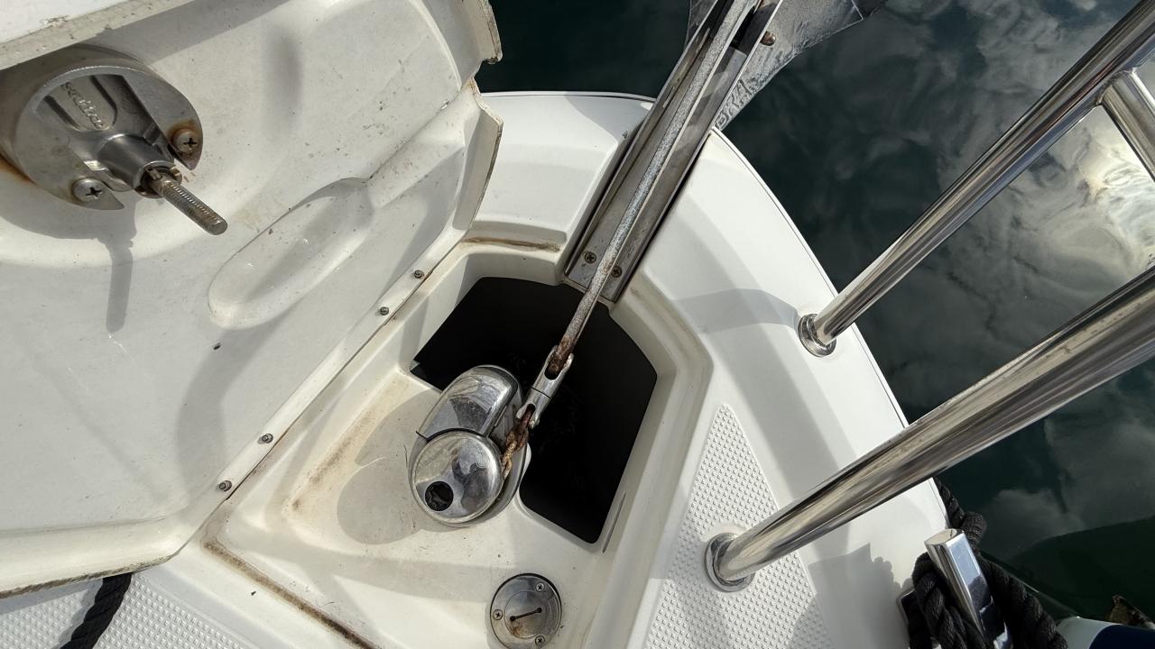 Les équipements de navigation comprennent GPS/traceur, sondeur, VHF, compas et propulseur d'étrave. Les équipements de confort incluent un guindeau électrique, une douchette de pont, un taud de soleil, des housses de protection et un système audio. Le coin cuisine est équipé d'un réfrigérateur, d'un évier et d'un éclairage intérieur.