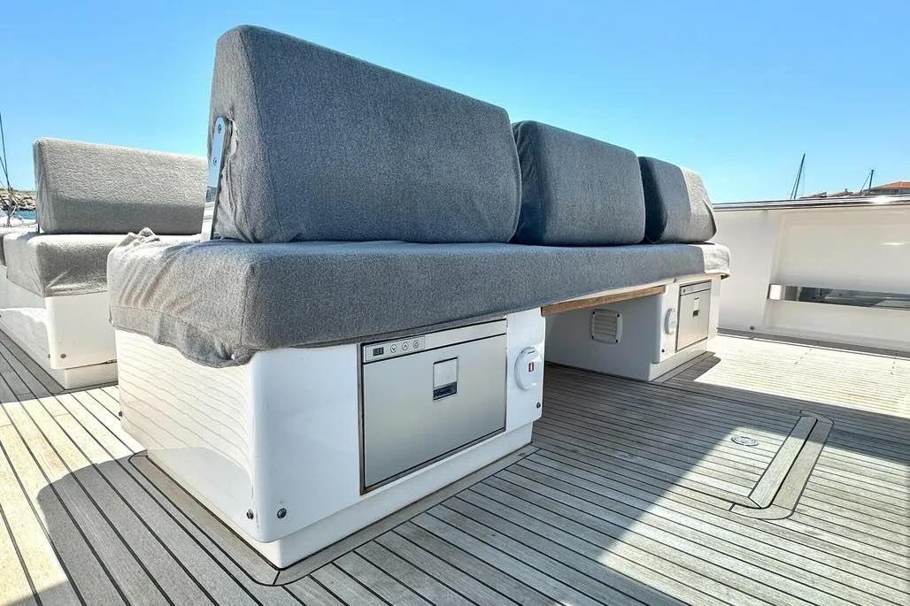 toiles sur poteaux carbone à l’avant et à l’arrière apportent ombre et confort lors des journées en mer, tandis que l’éclairage sous-marin valorise le bateau au mouillage comme en navigation