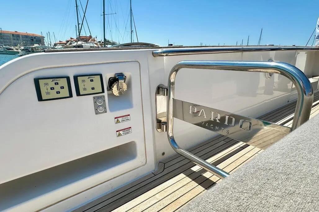 L’ADN du Pardo 43 : circulation fluide, cockpit convivial et larges bains de soleil. La table de cockpit électrique, la plateforme de bain hydraulique et la passerelle hydraulique facilitent la vie à bord. À l’arrière, le bain de soleil avec garage à annexe à ouverture électrique optimise l’espace tout en conservant une ligne épurée. Les