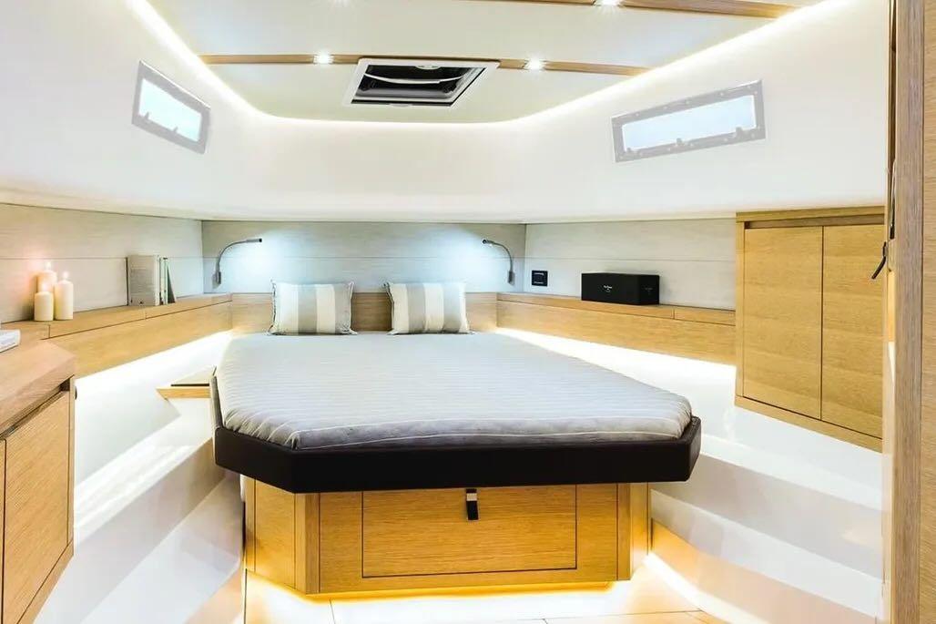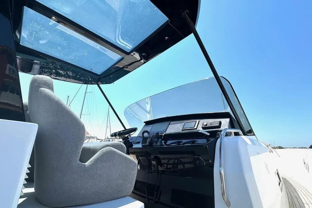 Côté performances, le bateau est propulsé par 2 x Volvo Penta D6 de 480 cv. Associée au Volvo Interceptor, au joystick de manœuvre et au pilote automatique, cette configuration garantit un excellent rendement et une grande facilité de prise en main, que ce soit en croisière ou lors des manœuvres au port.